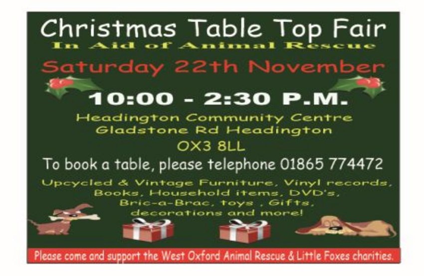 A Christmas Table top fair, in aid of Animal rescue (West Oxford animal rescue and Little foxes), Saturday 22nd November, at the Headington Community Centre, Gladstone rd, OX3 8LLOpen from 10 am - 2:30 pm Christmas decorations, toys and gifts , up-cycled and Vintage Furniture, vinyl records, books, jewellery household items, dvd's, bric-a-brac and moreRefreshments (Tea and Coffee) and Cakes