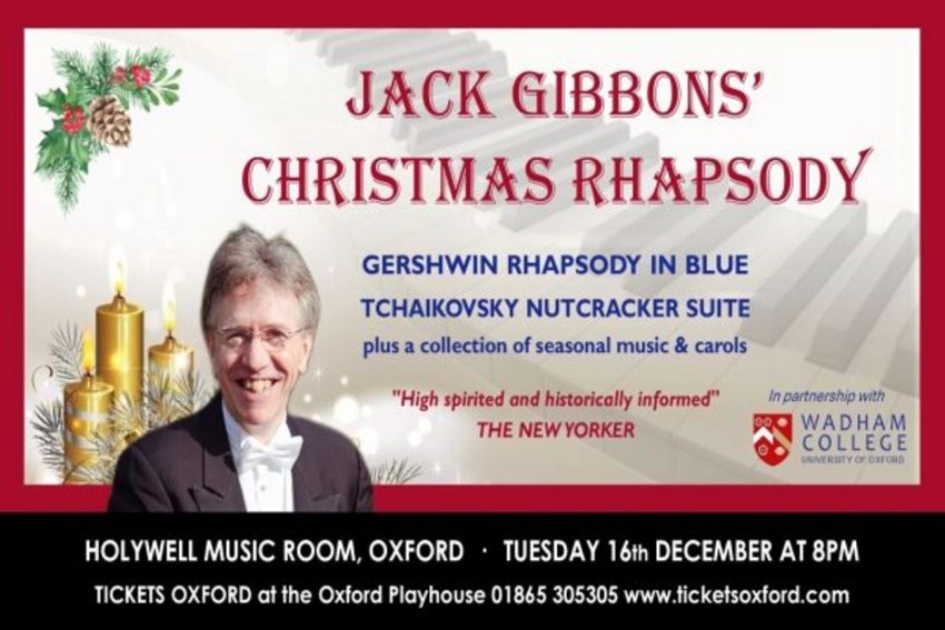 Acclaimed pianist Jack Gibbons performs a Christmas Rhapsody concert at Oxford's historic Holywell Music Room, featuring Gershwin's immortal Rhapsody in Blue, Tchaikovsky's Christmas masterpiece The Nutcracker Suite, carol arrangements by Brahms, Irving Berlin, Fats Waller and others, sleigh rides by Prokofiev, Mozart and Anderson, Gibbons' own arrangements of In Dulci Jubilo/Silent Night and more