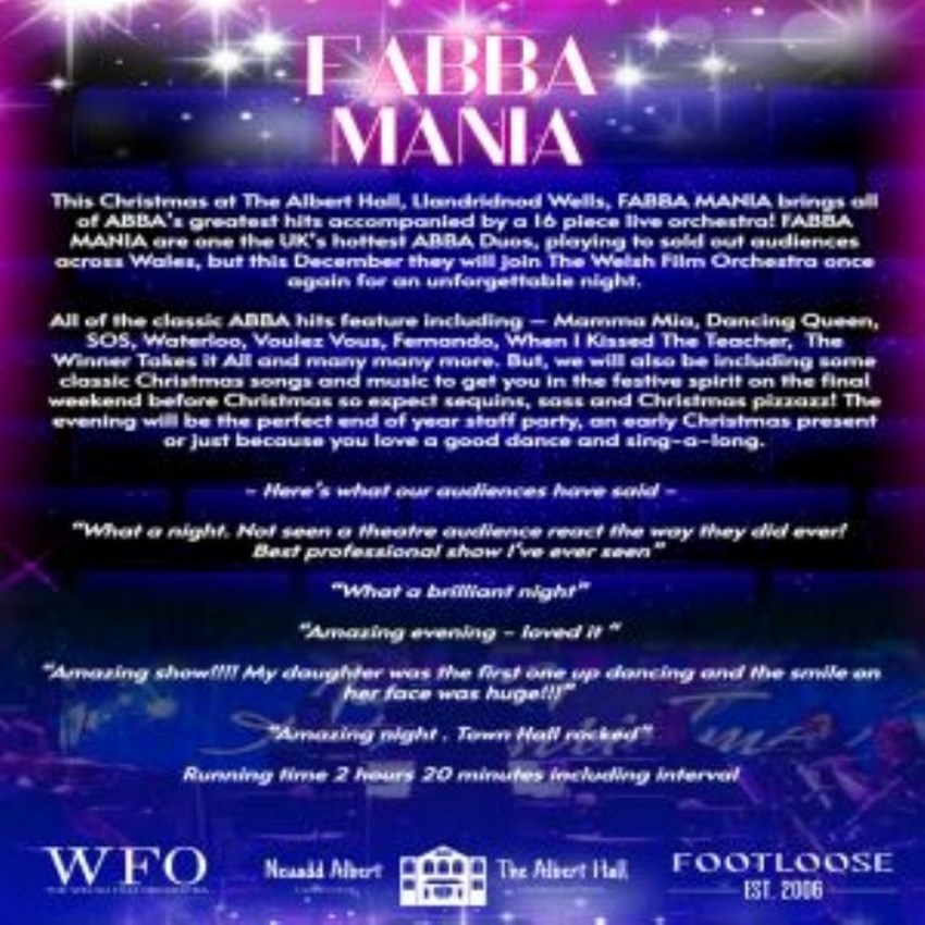 This Christmas at The Albert Hall, Llandridnod Wells, FABBA MANIA brings all of ABBA’s greatest hits accompanied by a 16 piece live orchestra! FABBA MANIA are one the UK’s hottest ABBA Duos, playing to sold out audiences across Wales, but this December they will join The Welsh Film Orchestra once again for an unforgettable night