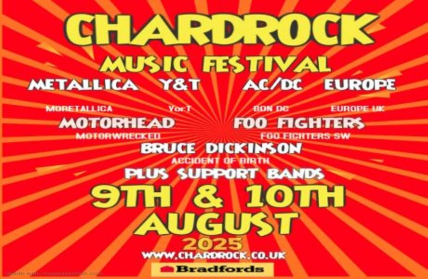 TWO DAYS OF LIVE MUSIC WITH 16 BANDS INCLUDING 7 TRIBUTE ACTS , RAISING MONEY FOR CHOSEN CHARITIES THIS YEAR SUPPORTING THE AWARENESS OF AUTISM TICKETS ONSALE AT WWW.CHARDROCK.CO.UK , CAMPING AVAILABLE , CHILDREN UNDER 5 FREE , UNDER 18 MUST BE ACCOMPANIED BY AN ADULT , SUPERB FOOD VENDORS , BAR , PARKING ,URL: Facebook: https://go.evvnt.com/3117580-2?pid=269