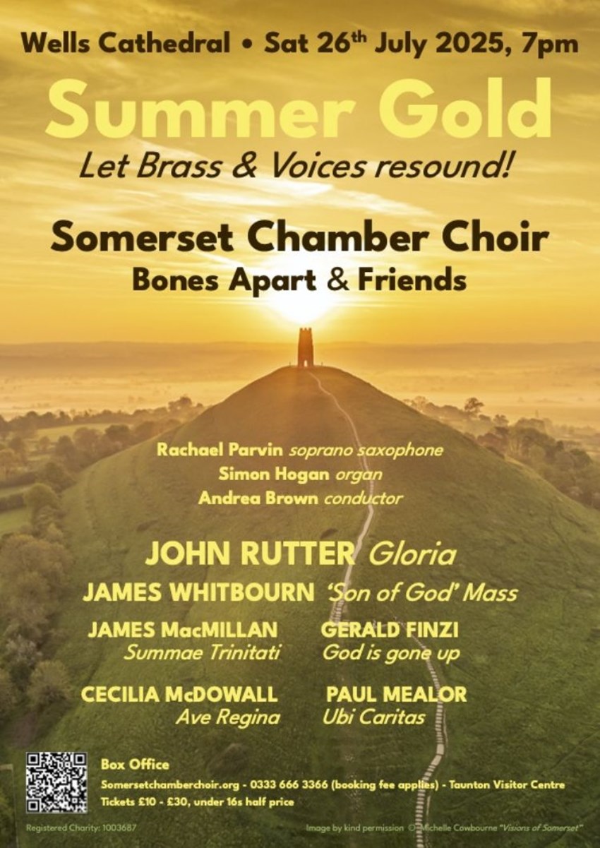 SUMMER GOLD Let Brass & Voices Resound! Saturday 26th July 2025 at 7.00pm Wells Cathedral JOHN RUTTER Gloria JAMES WHITBOURN 'Son of God' Mass JAMES MacMILLAN Summae Trinitati CECILIA McDOWALL Ave Regina PAUL MEALOR Ubi Caritas GERALD FINZI God is gone up And music for brassSomerset Chamber Choir Bones Apart & Friends Rachael Parvin soprano saxophone Simon Hogan organ Andrea Brown conductor
