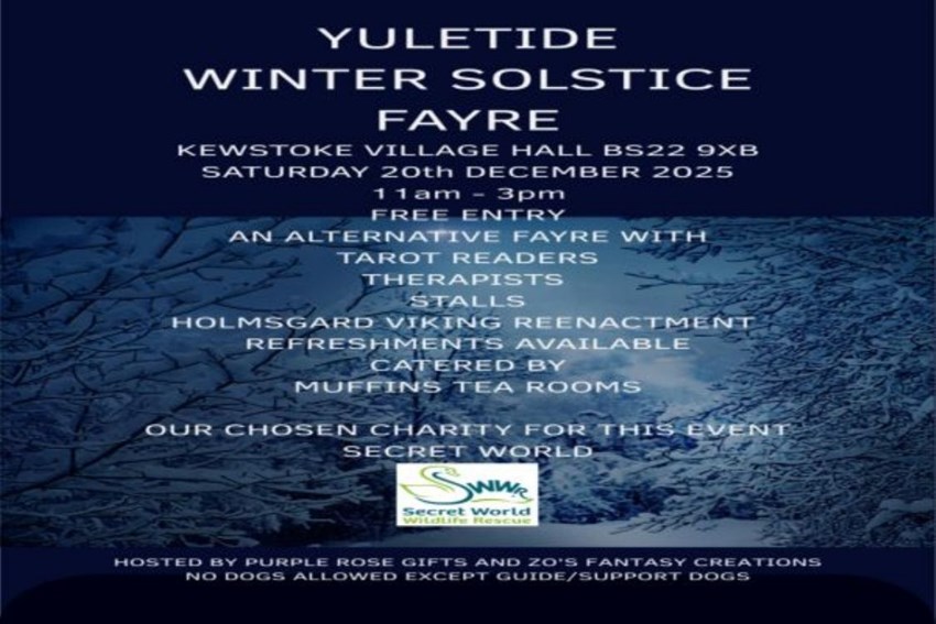Yuletide winter solstice fayre - Join us for a relaxing event and celebrate the Winter Solstice with a great range of alternative trade stalls , holistic therapists, Tarot readers ,Yoga demonstration and authentic Viking re-enactors , refreshments available catered by Muffins tea rooms and restaurant of Worle 11am to 3pm free entry- * strictly no dogs allowed except registered guide dogs and therapy dogs* in aid of Secret World Wildlife Rescue This event is hosted by- Purple Rose Gifts and Zos Fantasy Creations