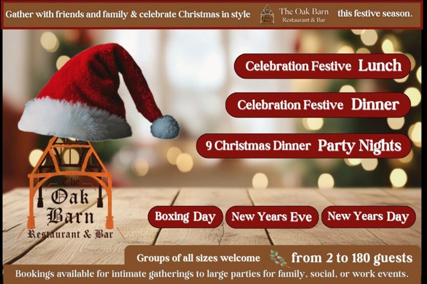 Make This Christmas Unforgettable at The Oak BarnCelebration Festive Lunch Celebration Festive Dinner 9 Christmas Dinner, Disco & Entertainment Party Nights Boxing Day New Years Eve New Years Day Bookings available for intimate gatherings to large parties for family, social or work events