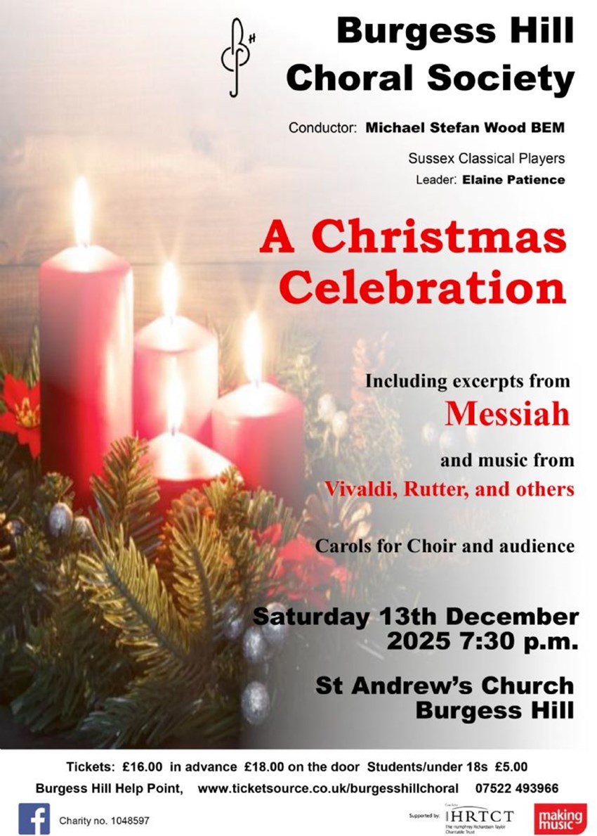 Tickets: from Burgess Hill Help Point OR from Jane Leng (burgesshillchoralsociety@gmail.com or 07522 493966) OR from TicketSource https://www.ticketsource.co.uk/burgesshillchoral OR from choir members. A few tickets will be available on the door.