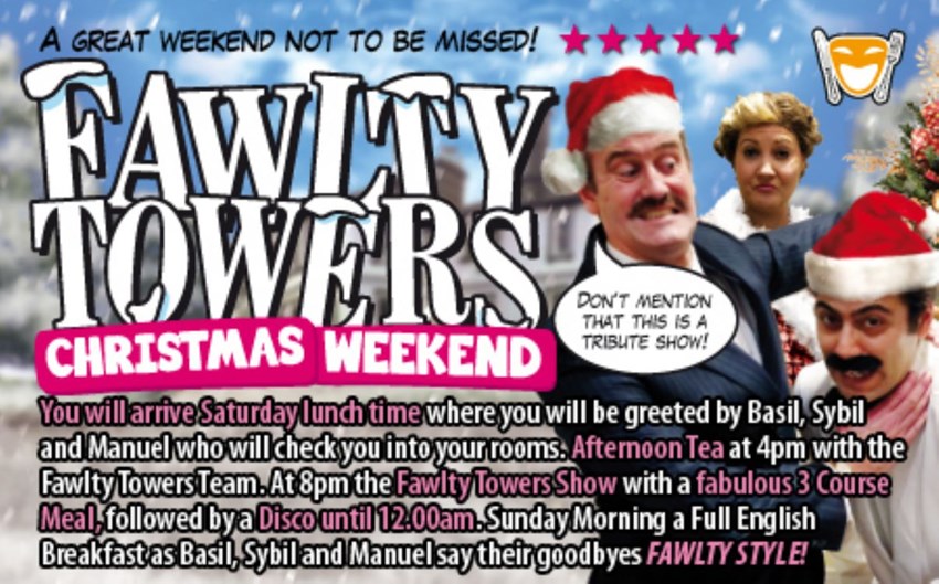 MERRYCHRISTMAS You will arrive Saturday lunch time where you will be greeted by Basil, Sybil and Manuel who will check you into your rooms.Afternoon Tea will be served at 4.00pm with the help of the Fawlty Towers TeamAt 8.00pm the Fawlty Towers Show will commence, and you will enjoy a fabulous 3 Course Meal, followed by a Disco until 12.00am.Sunday Morning a Full English Breakfast as Basil, Sybil and Manuel say their goodbyes FAWLTY STYLE!