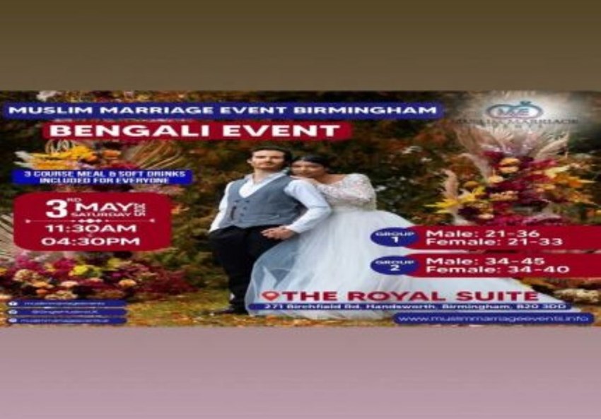 We are holding the next Birmingham Bengali Muslim Marriage Event on Sunday 3rd May 2025 at The Royal Suite, 271 Birchfield Road, Perry Barr, Birminghan, B20 3DD