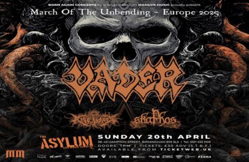 Polish death-metal legends VADER - MARCH OF THE UNBENDING - EUROPE 2025 plus RISE OF KRONOS & SKAPHOS. Tickets https://tinyurl.com/BAvader