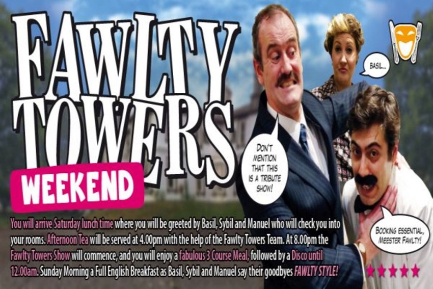 You will arrive Saturday lunch time where you will be greeted by Basil, Sybil and Manuel who will check you into your rooms.Afternoon Tea will be served at 4.00pm with the help of the Fawlty Towers TeamAt 8.00pm the Fawlty Towers Show will commence, and you will enjoy a fabulous 3 Course Meal, followed by a Disco until 12.00amSunday Morning a Full English Breakfast as Basil, Sybil and Manuel say their goodbyes FAWLTY STYLE