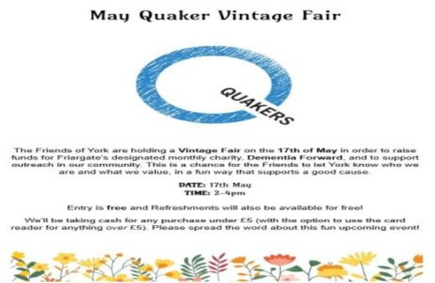 York Quakers are hosting a Vintage Fair on the 17th of May from 2-4pm!