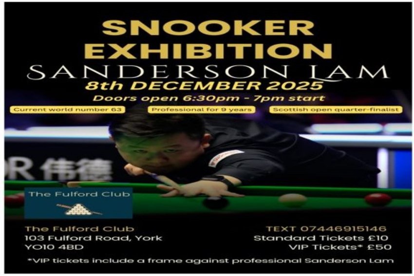 The format will be for players to take on professional Sanderson Lam VIP tickets are available to secure a frame and then some will be open to a raffle Signed snooker goods will be raffled and there will be food available to buy at the event which is organised to raise funds to help refurbish the snooker tables and other parts of the club all proceeds raised will be put back into the club All are welcome to come to the club and attend the event .