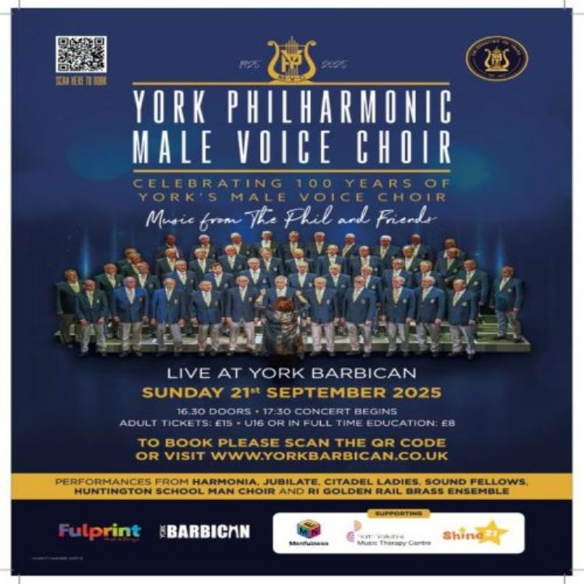 Enjoy the mass choir ensemble from Malton, Easingwold, and York bringing together the choirs Harmonia, Jubilate, Huntington School Man Choir, Sound Fellows and Citadel Ladies with a brass ensemble from the York RI Golden Rail BandThe York Philharmonic Male Voice Choir have been regular winners at national Choir festivals and a BBC choir of the year finalistAs seen on TV with the filming of Carols in Kirkgate this choir celebrates 100yrs of performing for York and throughout EuropeThe profit from this concert will be shared by 3 local charities - Menfulness ( mental health for men) Shine21 ( support for families with babies with Down Syndrome ) and North Yorkshire Music Therapy Centre ( music therapy for people with learning disability, dementia and mental health issues ) Bring your family and friends for what is promised to be a truly joyous occasion!